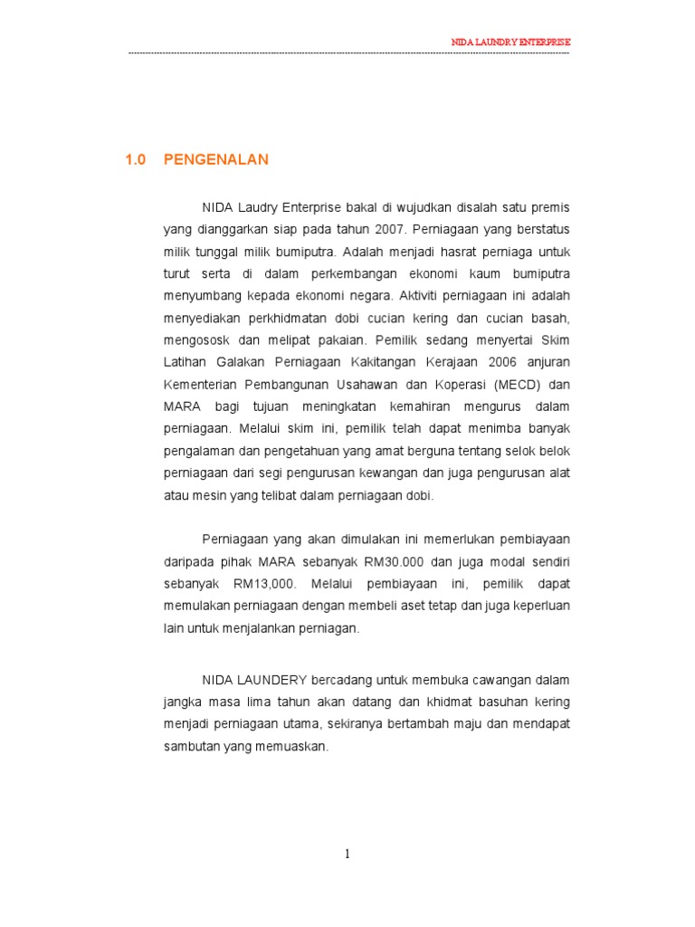 Antaranya adalah faktor kesuntukan masa dan faktor cuaca. NIDA LAUNDRY ENTERPRISE Alamat Berdaftar. Rancangan Perniagaan ini disediakan adalah bagi mendapatkan pembiayaan kewangan dari XXXXBANK bagi projek Kedai Dobi saya iaitu Dobi XXXX di Shah Alam.